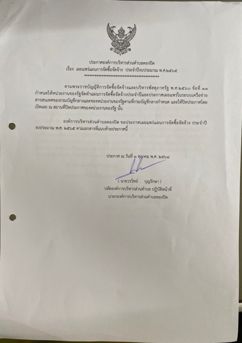 ประกาศองค์การบริหารส่วนตำบลตองปิด เรื่อง เผยแพร่แผนการจัดซื้อจัดจ้าง ประจำปีงบประมาณ พ.ศ.2565