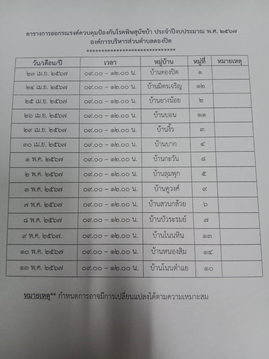 องค์การบริหารส่วนตำบลตองปิด ประชาสัมพันธ์ตารางการออกรณรงค์ควบคุมป้องกันโรคพพิษสุนัขบ้า ประจำปีงบประมาณ พ.ศ.2567