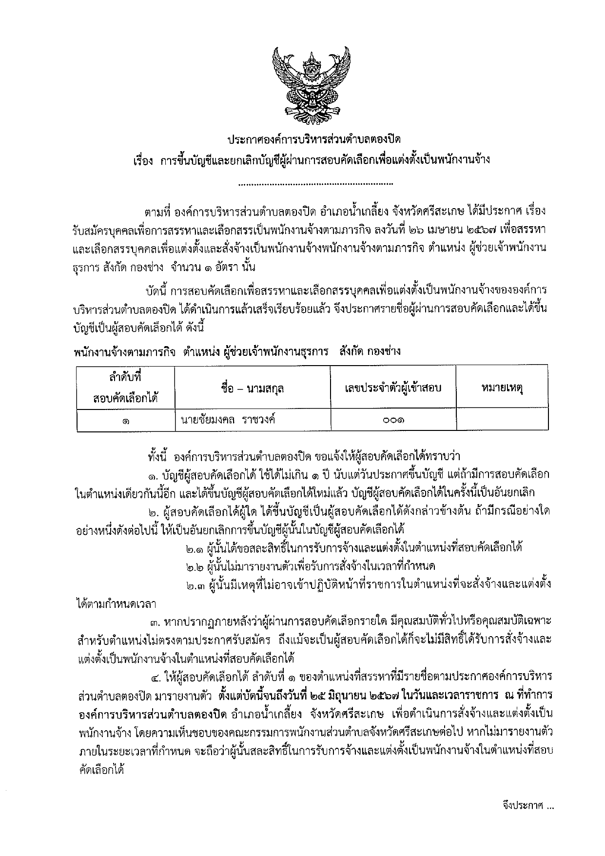 ประกาศองค์การบริหารส่วนตำบลตองปิด เรื่อง การขึ้นบัญชีและยกเลิกบัญชีผู้ผ่านการสอบคัดเลือกเพื่อแต่งตั้งเป็นพนักงานจ้าง