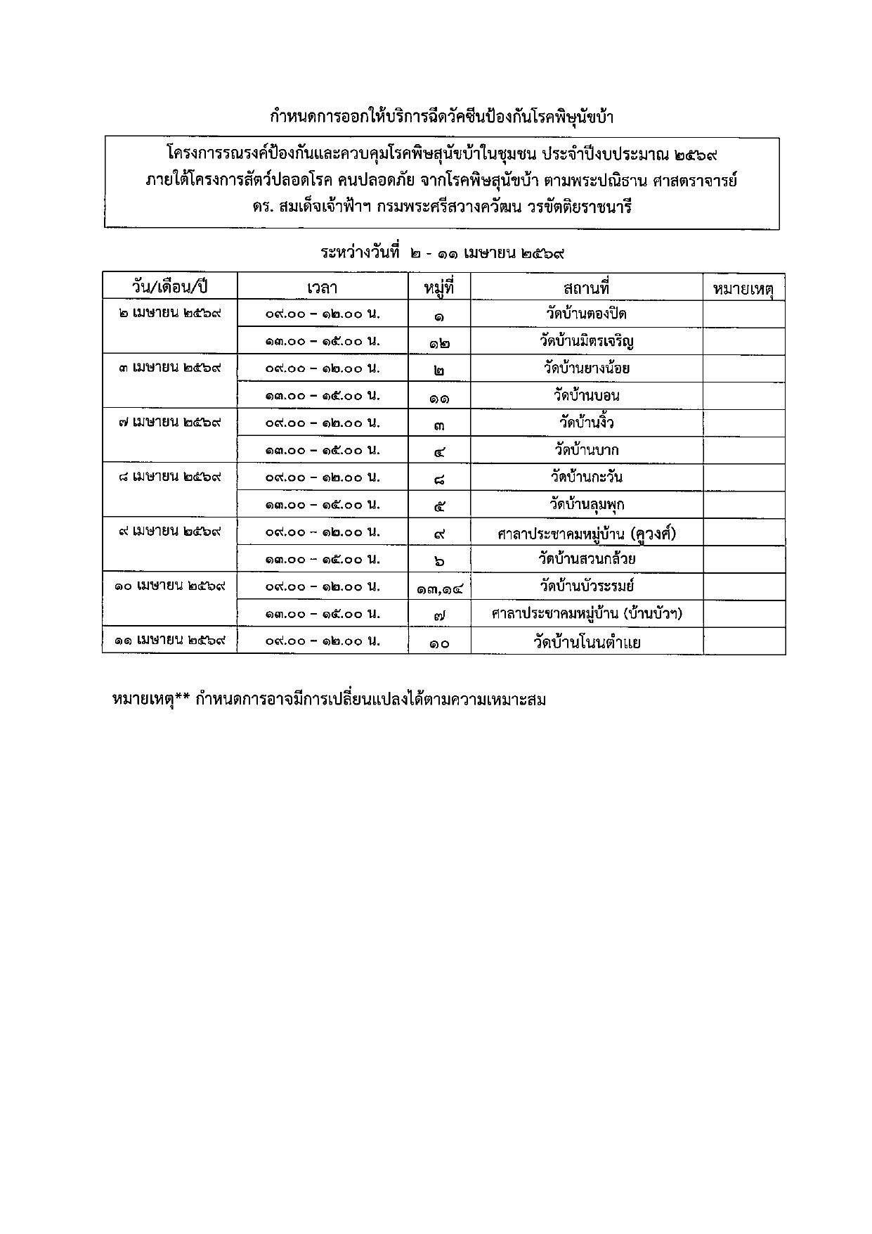 ขอนุญาตประชาสัมพันธ์ ด้วยองค์การบริหารส่วนตำบลตองปิด ได้จัดทำโครงการรณรงค์ป้องกันและควบคุมโรคพิษสุนัขบ้าในชุมชน และออกฉีดวัคซีนป้องกันโรคพิษสุนัขบ้า ประจำปีงบประมาณ พ.ศ. 2569 ระหว่างวันที่ 2-11 เมษายน 2569