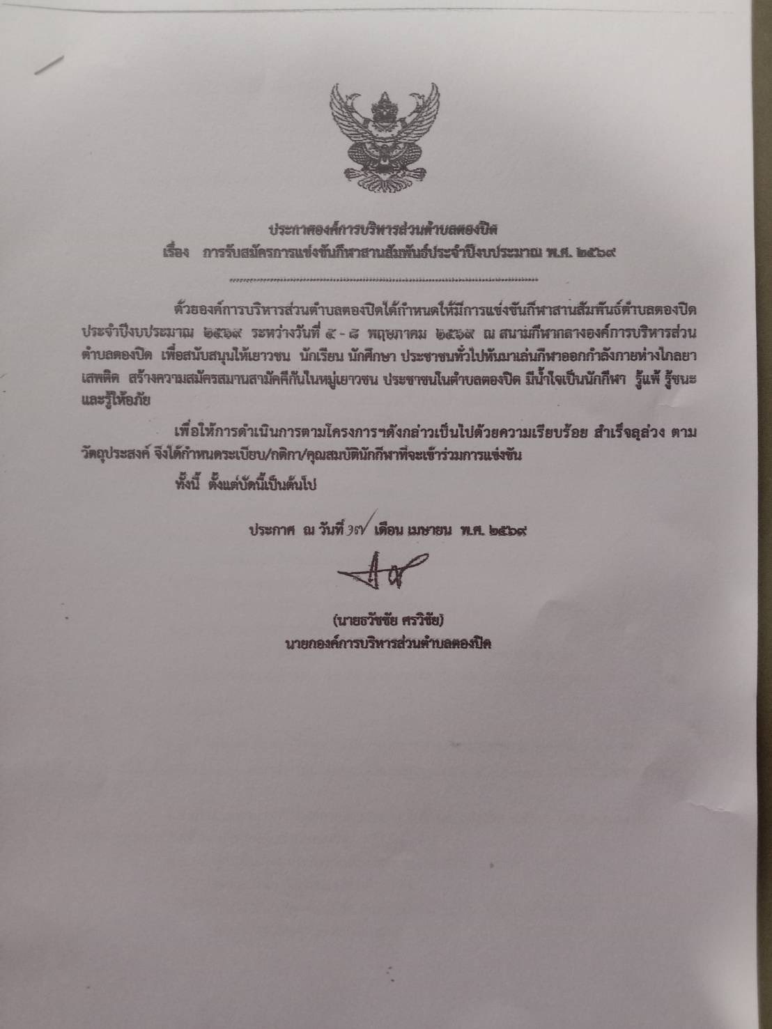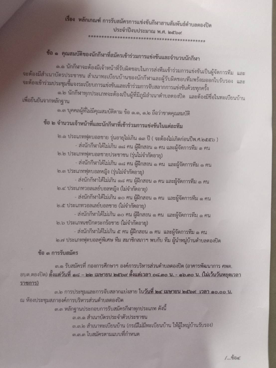 ประกาศองค์การบริหารส่วนตำบลตองปิด???? เรื่องการรับสมัครการแข่งขันกีฬาสายสัมพันธ์ประจำปีงบประมาณ พ.ศ. 2569 ????????ด้วยองค์การบริหารส่วนตำบลตองปิดได้กำหนดให้มีการแข่งขันกีฬาสายสัมพันธ์ตำบลตองปิดประจำปีงบประมาณ พ.ศ. 2569 ระหว่างวันที่ 4-8 พฤษภาคม พ.ศ. 2569 ณ. สนามกีฬากลางองค์การบริหารส่วนตำบลตองปิด เพื่อสนับสนุนให้เยาวชน นักเรียน นักศึกษา ประชาชนทั่วไปหันมาเล่นกีฬาออกกำลังกายห่างไกลยาเสพติด สร้างความสมัครสมานสามัคคีในหมู่เยาวชน ประชาชนในตำบลตองปิดมีน้ำใจเป็นนักกีฬา รู้แพ้ รู้ชนะ รู้อภัย  ????????เพื่อให้การดำเนินการตามโครงการดังกล่าวเป็นไปด้วยความเรียบร้อยสำเร็จลุล่วงตามวัตถุประสงค์จึงได้กำหนดระเบียบ กติกา คุณสมบัตินักกีฬาที่จะเข้าร่วมการแข่งขัน ✅การรับสมัคร✅ รับสมัครที่กองการศึกษาฯ องค์การบริหารส่วนตำบลตองปิด (อาคารพัฒนาการ ศพด. อบต.ตองปิด) ตั้งแต่วันที่ 18-22 เมษายน 2569 เวลา 08.30-16.30 น. ไม่เว้นวันหยุดราชการ