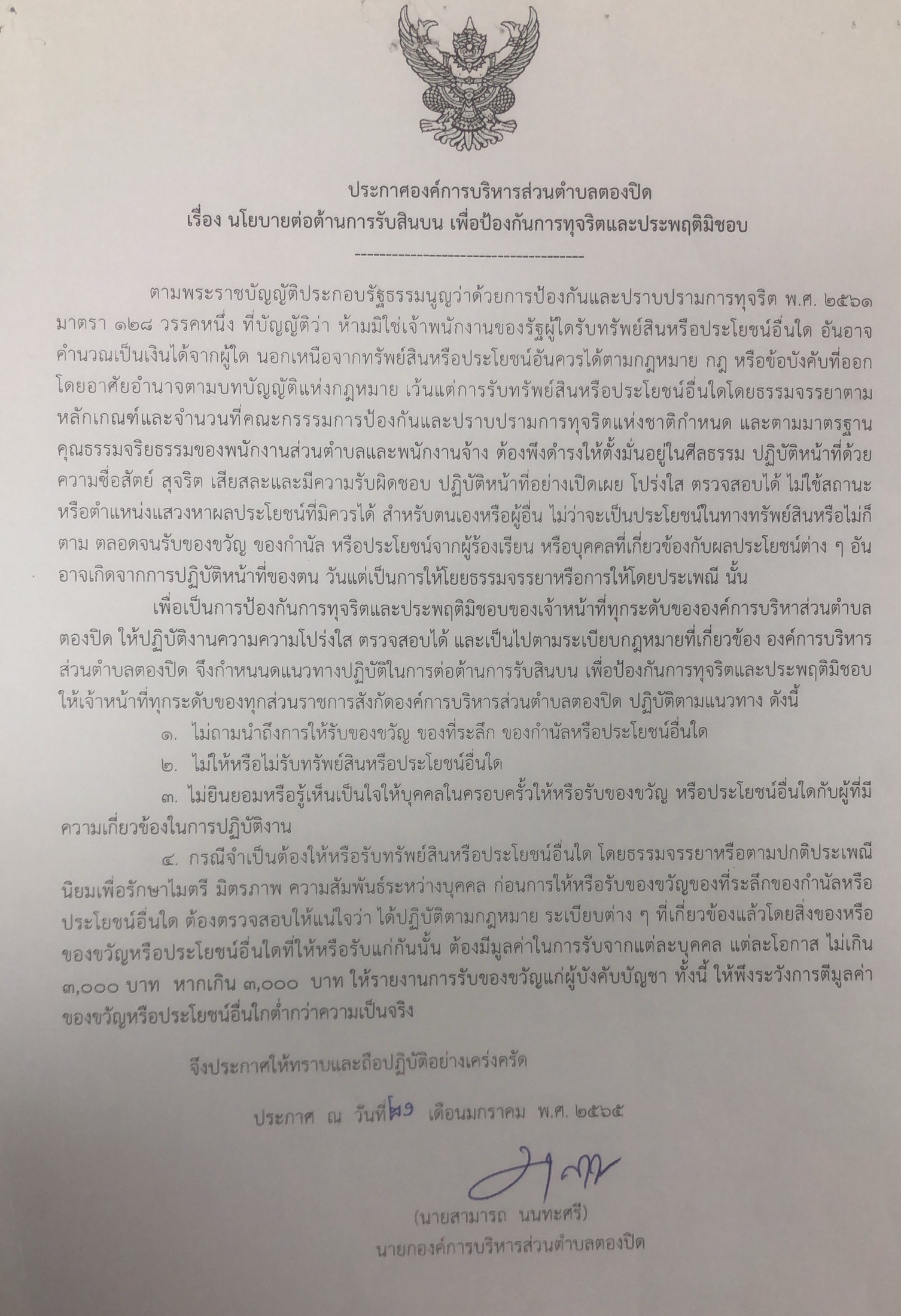 ประกาศนโยบายต่อต้านการรับสินบน เพื่อป้องกันการทุจริตและประพฤติมิชอบ