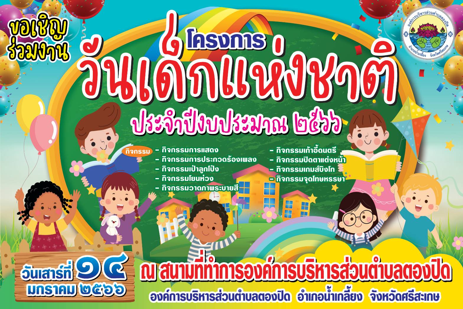 ขอเชิญร่วมกิจกรรมงานวันเด็กแห่งชาติ ประจำปี 2566 ในวันเสาร์ ที่14 มกราคม 2566 ณ สนามกีฬาที่ทำการองค์การบริหารส่วนตำบลตองปิด เริ่มตั้งแต่เวลา 07.00 น. ถึง 15.00 น.